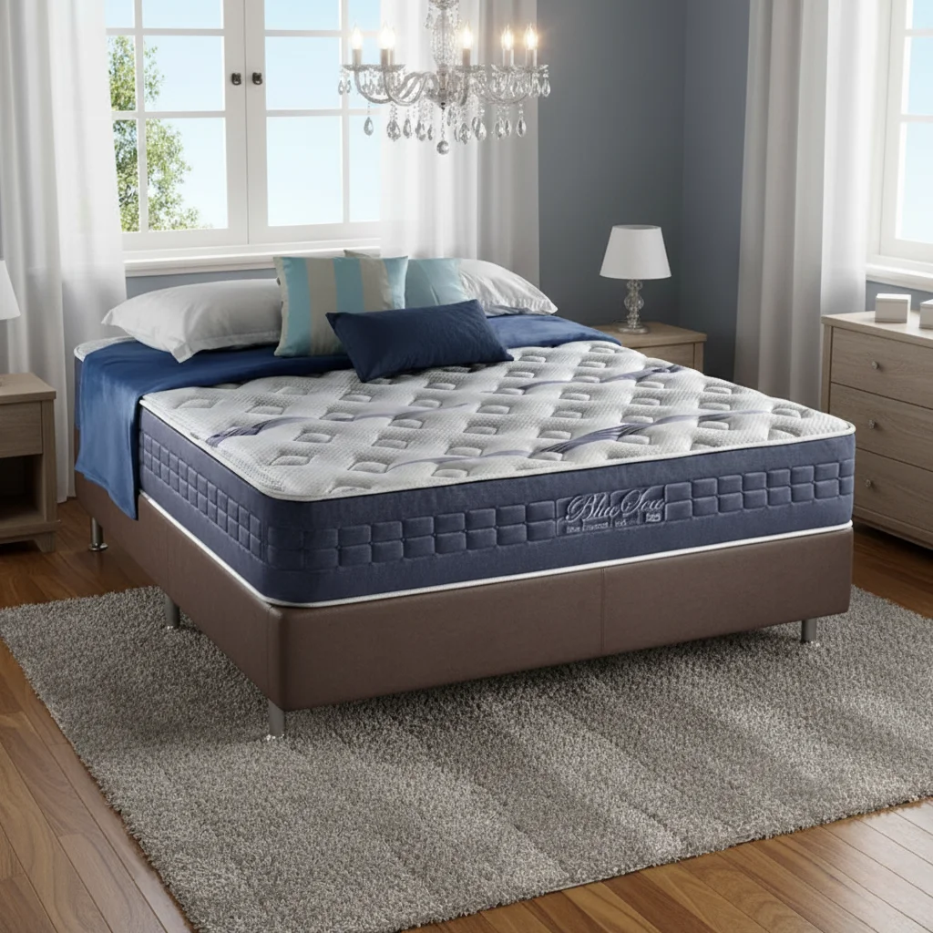 Colchão Casal Blue Sea D28 + Base Box Simples Corino Marrom – ANJOS COLCHÕES + ALTO NÍVEL CAMAS E COLCHÕES