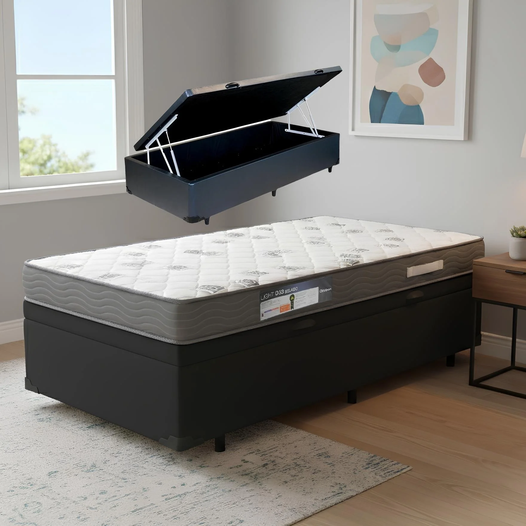 Colchão Solteiro Light D33 + Base Box Baú Preto – ORTOBOM + BIOSTAR