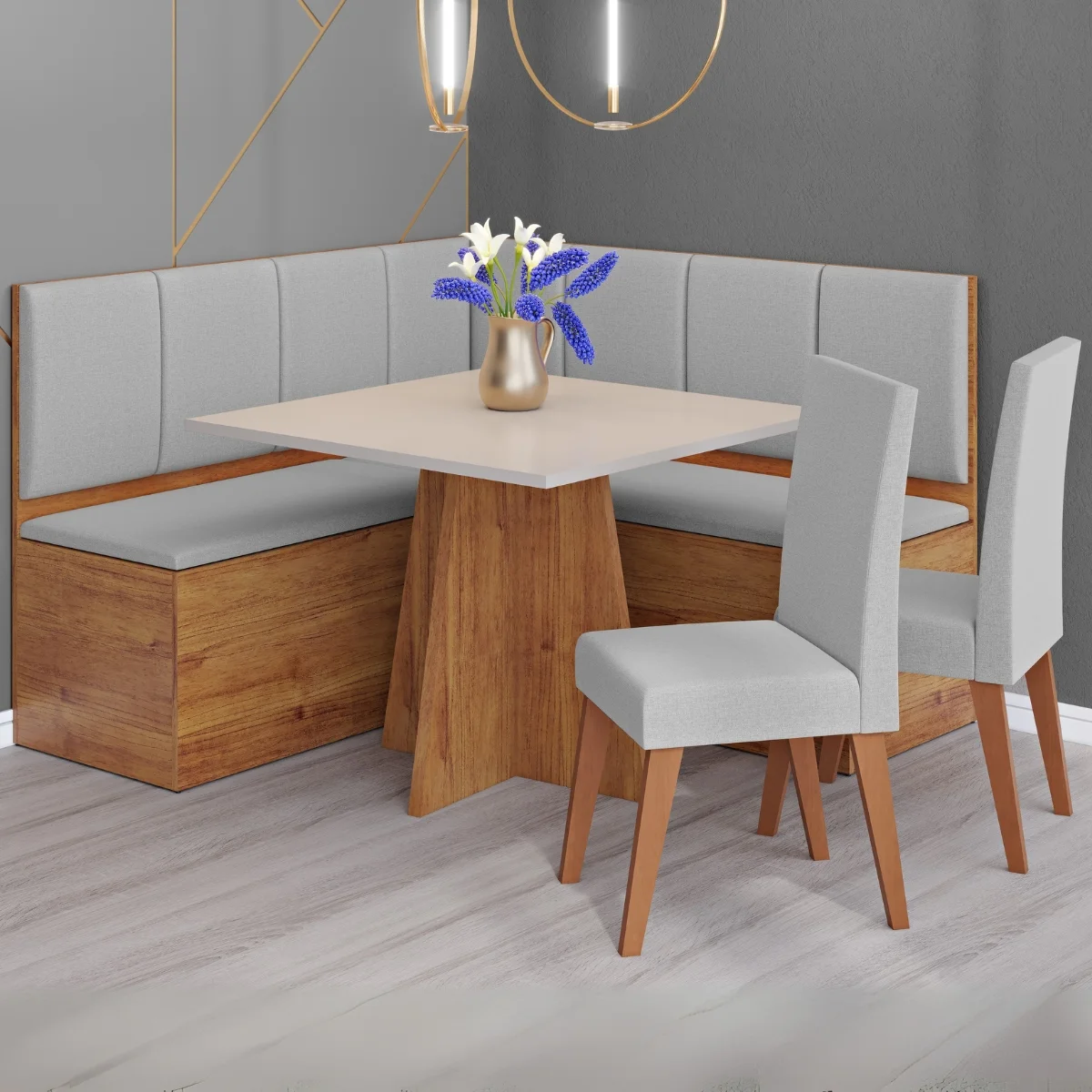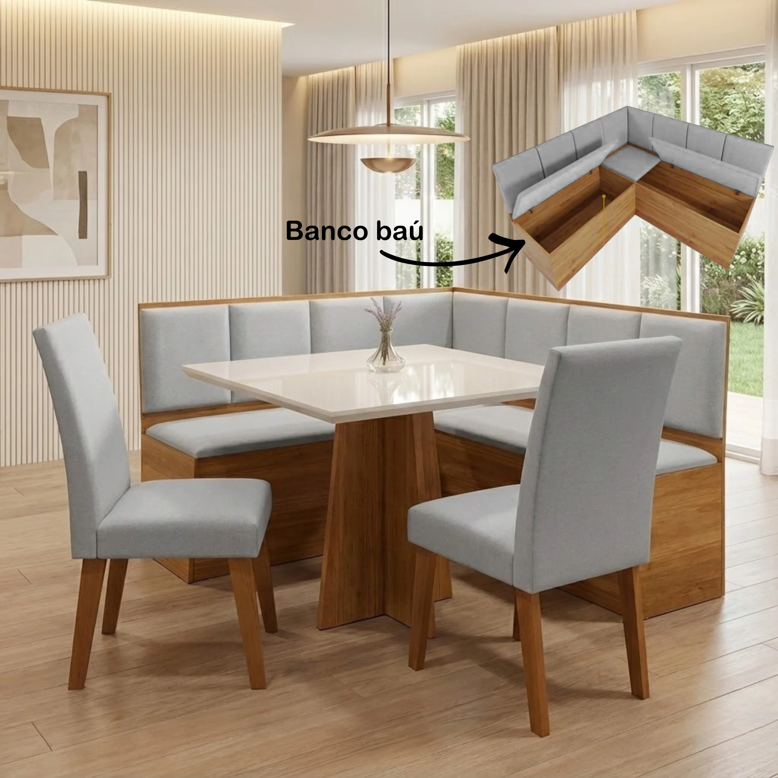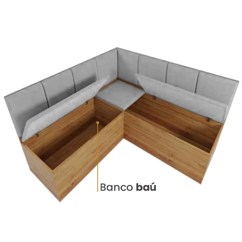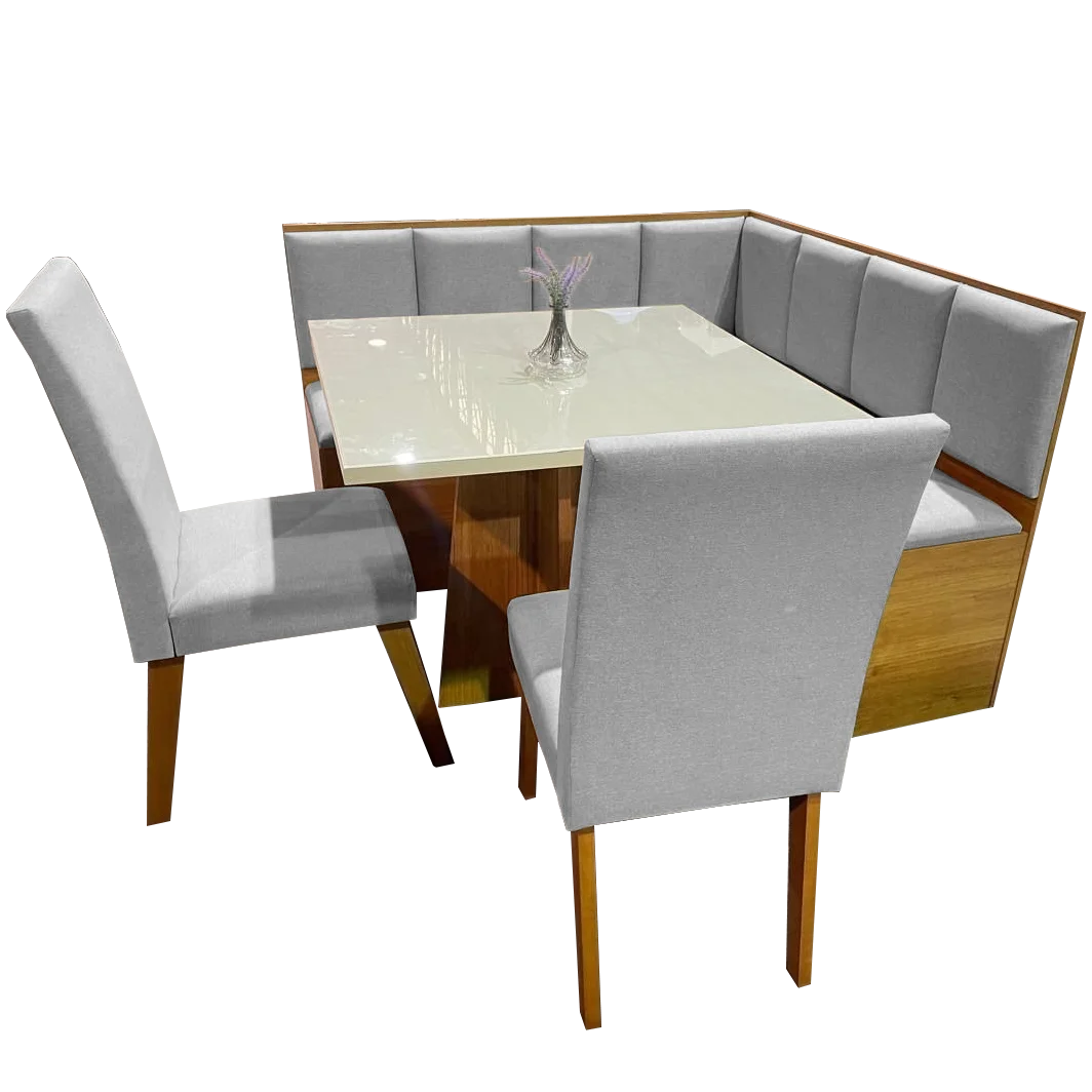 Conjunto Canto Alemão Baú + Mesa Mon/Soberano Mel/Blonde + 2 Cadeiras Milão Mel/Linho Inox – VIERO MÓVEIS