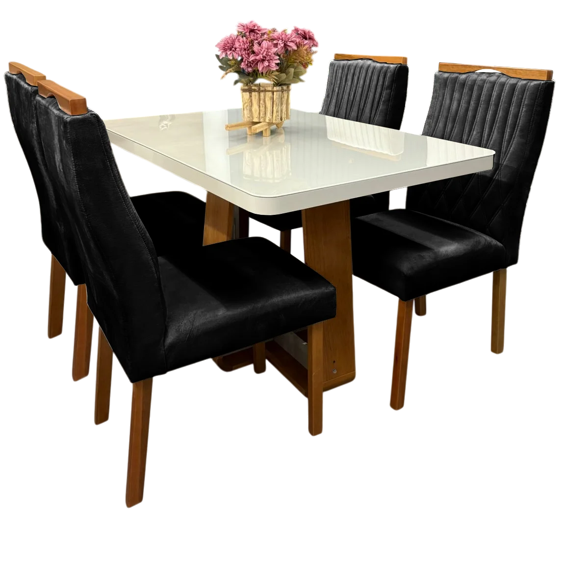 Mesa Sintonia (Tampo Maxi) 120 Amêndoa Clean/Off White com 4 Cadeiras Gênova Veludo Preto – LOPAS + ART ASSENTOS
